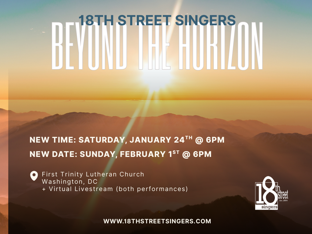 Join us Saturday, January 24 at 7:00pm and Sunday, January 25 at 4:00pm at First Trinity Lutheran Church in Washington, DC, as we gather to reflect, listen, and imagine what comes next. With pay-what-you-can tickets, free student admission, and a Saturday livestream, Beyond the Horizon invites all to pause together at the threshold—and to listen for what lies beyond.